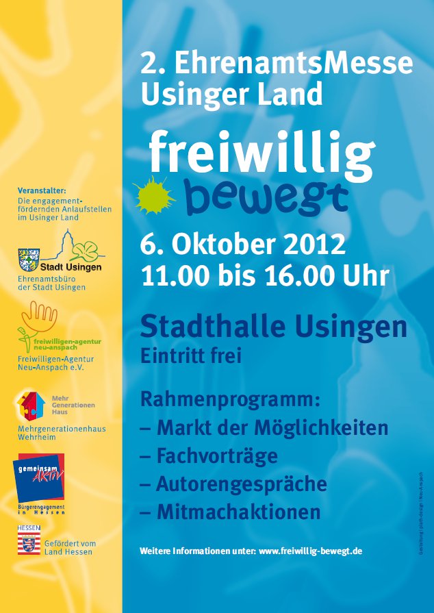 2009 war ich maßgeblich am Aufbau der Freiwilligenagentur Usinger Land beteiligt, seither in nahezu allen Feldern rund um das Thema Ehrenamt aktiv und im Verein sowohl im Vorstand und als angestellte Projektleiterin tätig. Während dieser Zeit habe ich Paten/Lotsen ausgebildet und begleitet, Leseförderprojekte initiiert, neue Formen des Engagements durch Online-Volounteering umgesetzt, Treffpunkte wie z.B. Repair-Cafe, Sachspendenvermittlung, Lebensmittelretten und die Nähoase u.a. mit Freiwilligen und Partnern eingerichtet.